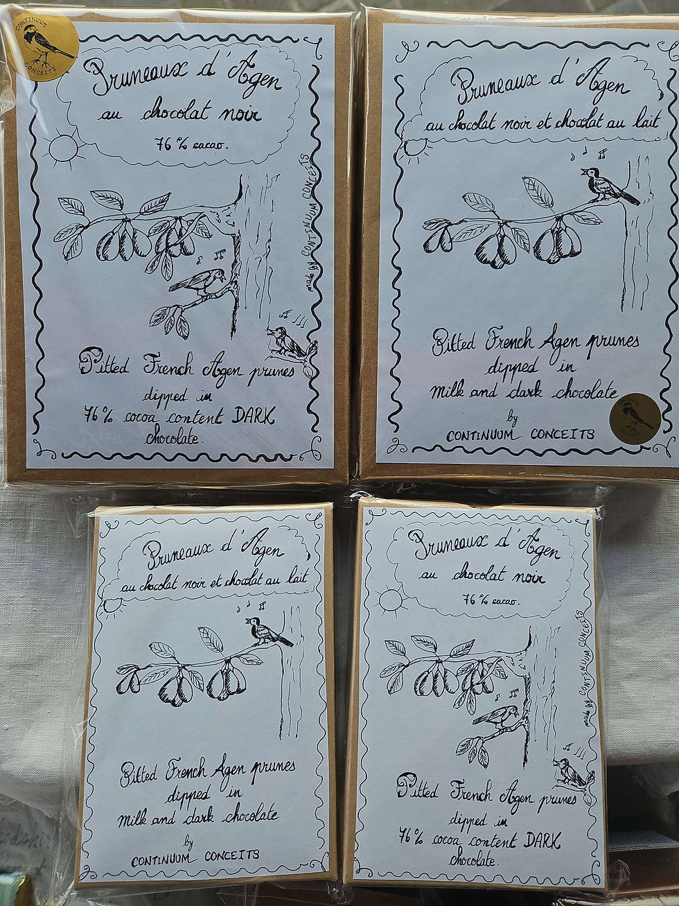 Welcome to Continuum Conceits, home of the Franco-British confectionery, where you will find specialities and artisan unique chocolates, made in the dedicated barn kitchen in Herefordshire, UK. Agen Prunes with a filling dipped in chocolate, chocolate tablettes (bars) with a centre or flavoured, 42% milk or 76% dark chocolate, pruneaux d’Agen fourrés , au chocolat, a twist on a local French speciality where l come from. (Agen prunes with a filling, dipped in chocolate)